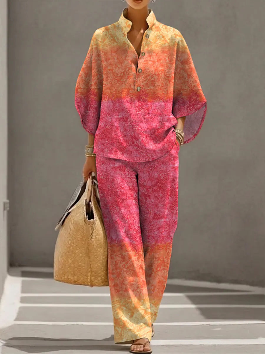 Women's Retro Gradient Floral Art Print Casual 3/4 Sleeve Top And Pants Cotton Linen Suits