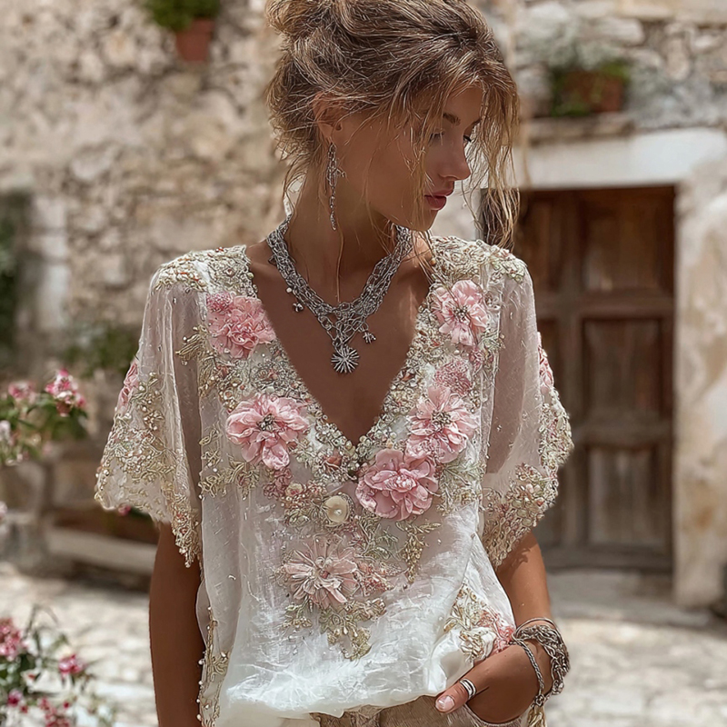 Women's Vintage Pink Flowers Embroidered Art V-neck Short Sleeve T-shirt