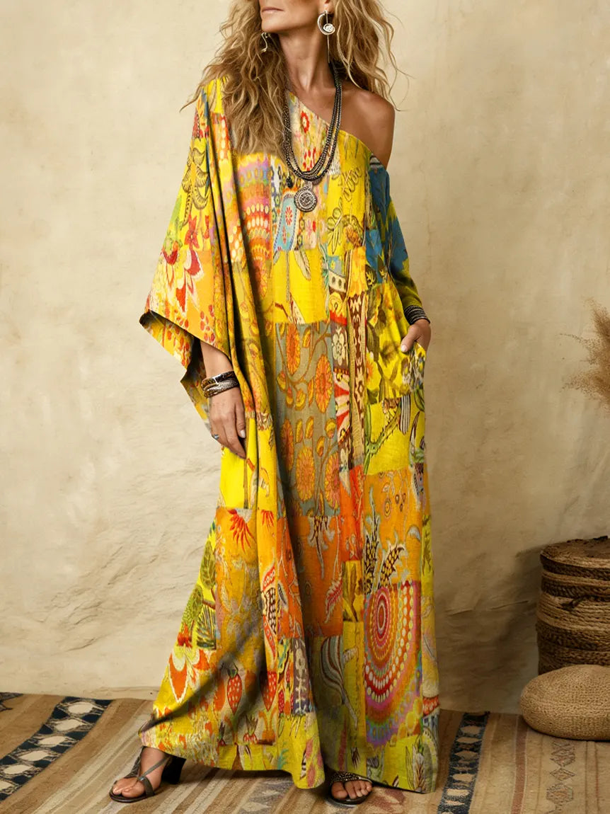 Women's Bohemian Floral Patchwork Art Print Kaftan Dress