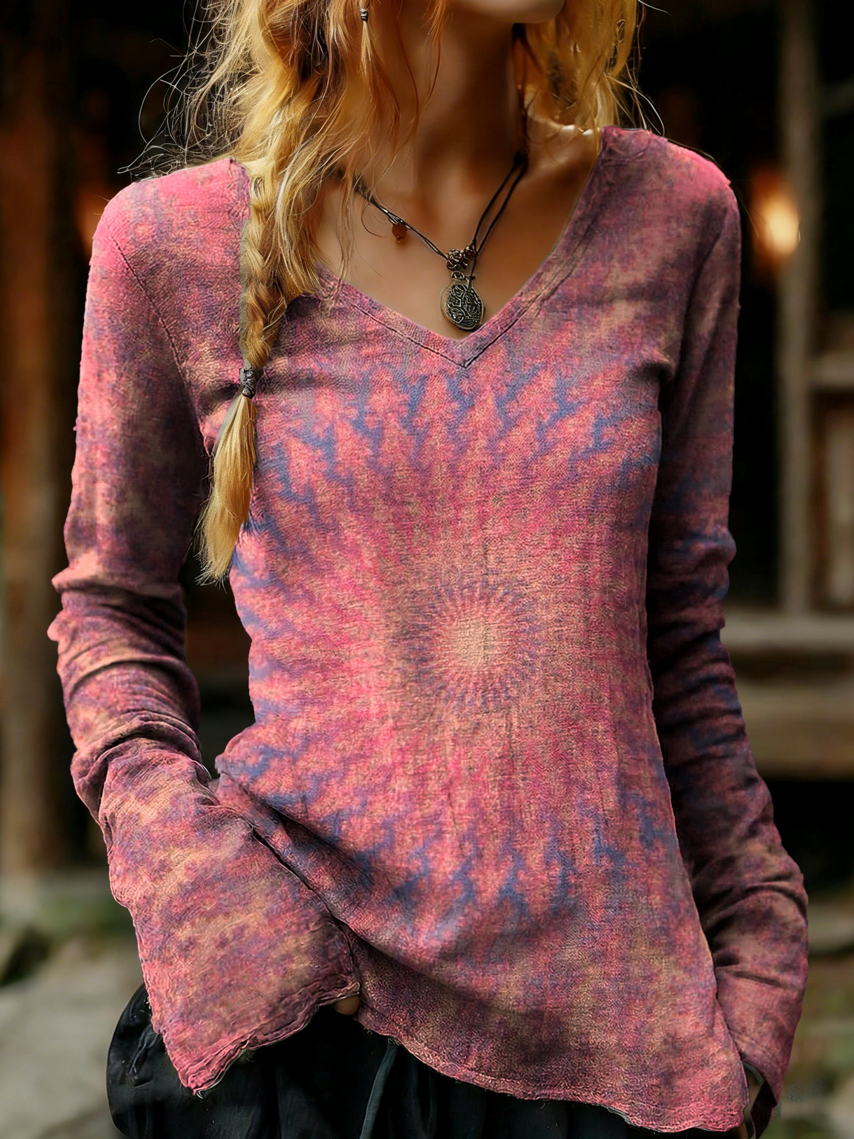 Women's Tie-dye Mandala Art Prints V Neck T-shirt