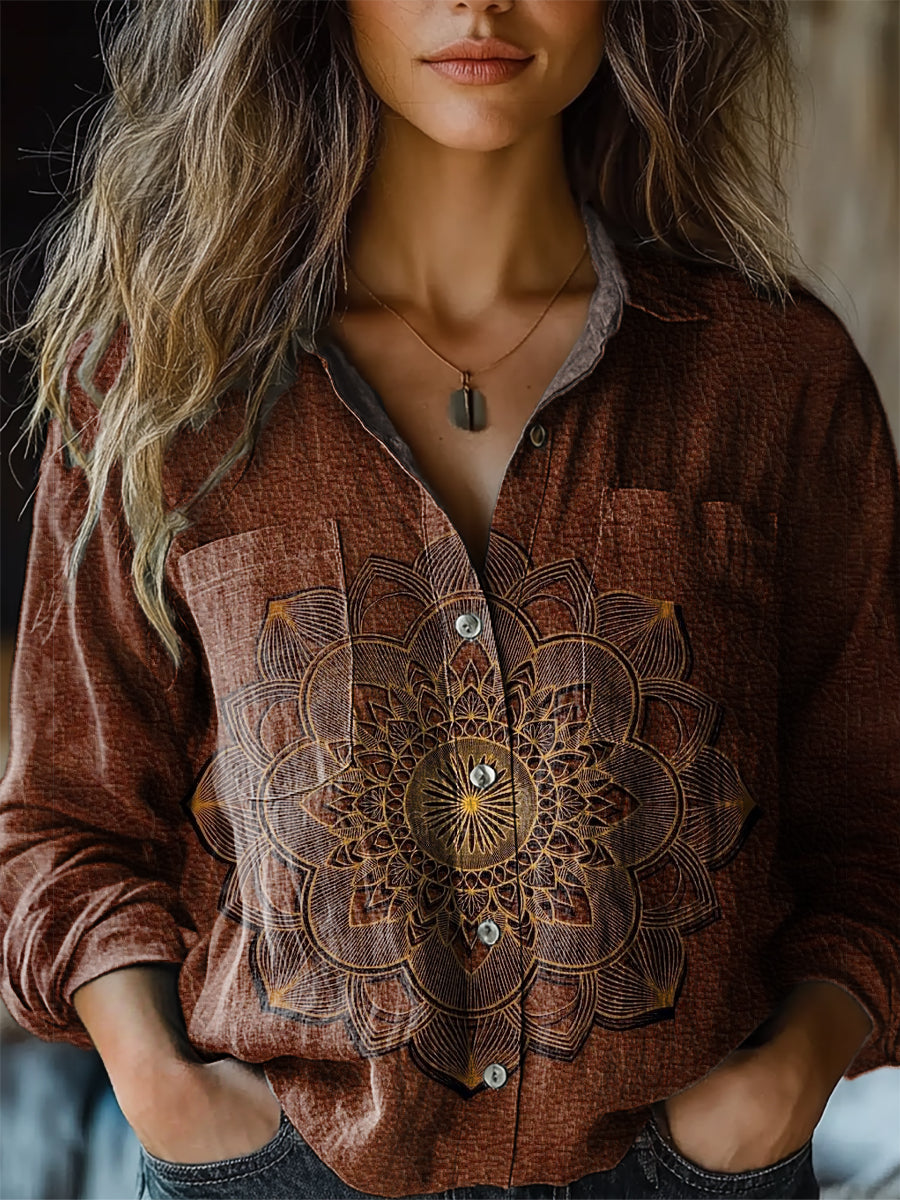 Women's Vintage Mandala Art Print Long Sleeve Comfortable Cotton Shirt
