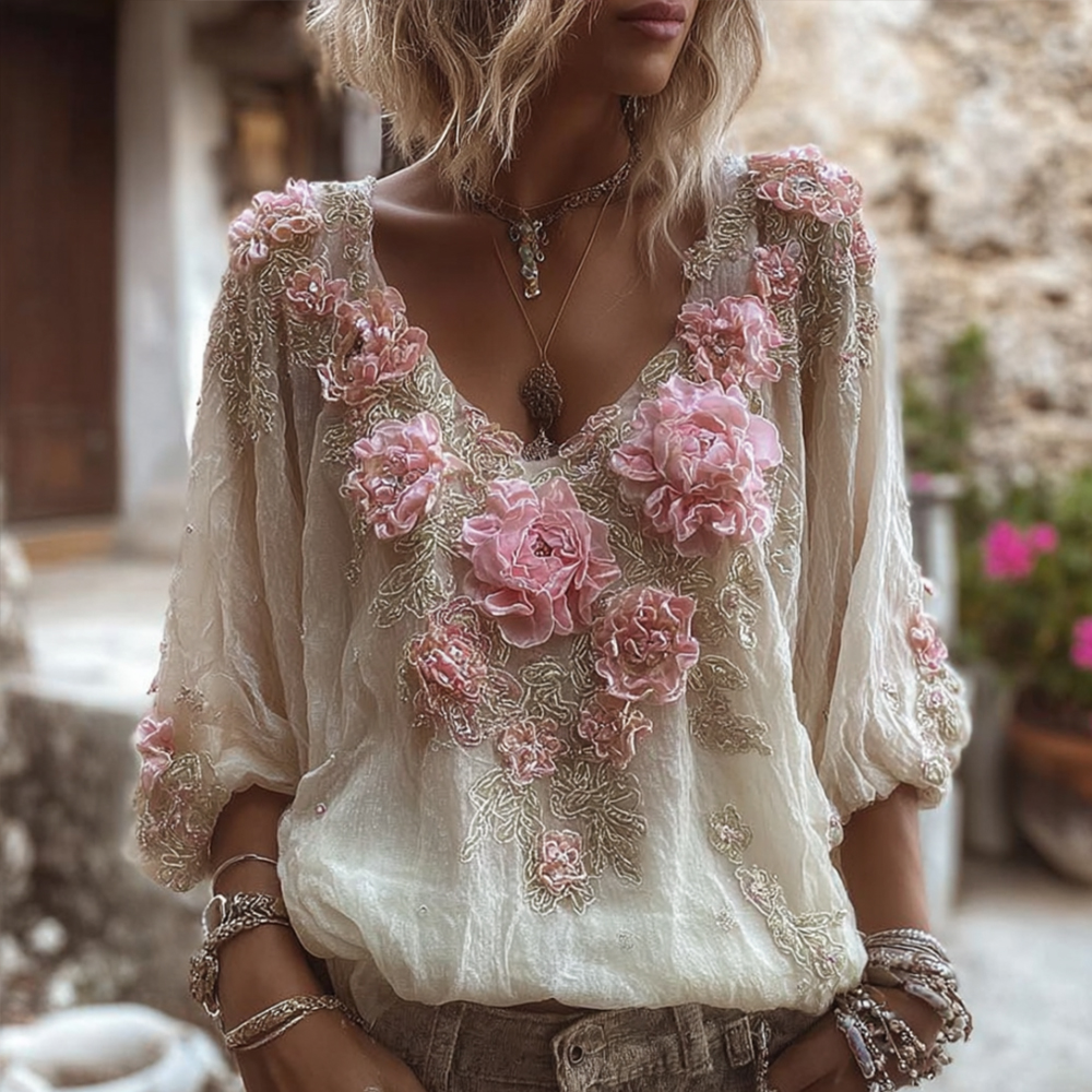 Women's Vintage Floral Embroidered Long-sleeved Top