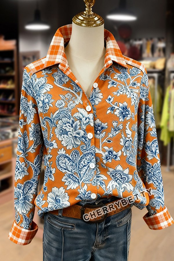 Vintage Floral Print Plaid Long Sleeve Blouse