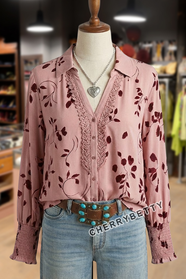 Spring Floral Print Lace V-Neck Smocked Long Sleeve Blouse
