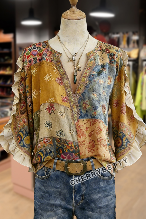 Vintage Floral Print V-Neck Ruffle Trim Blouse