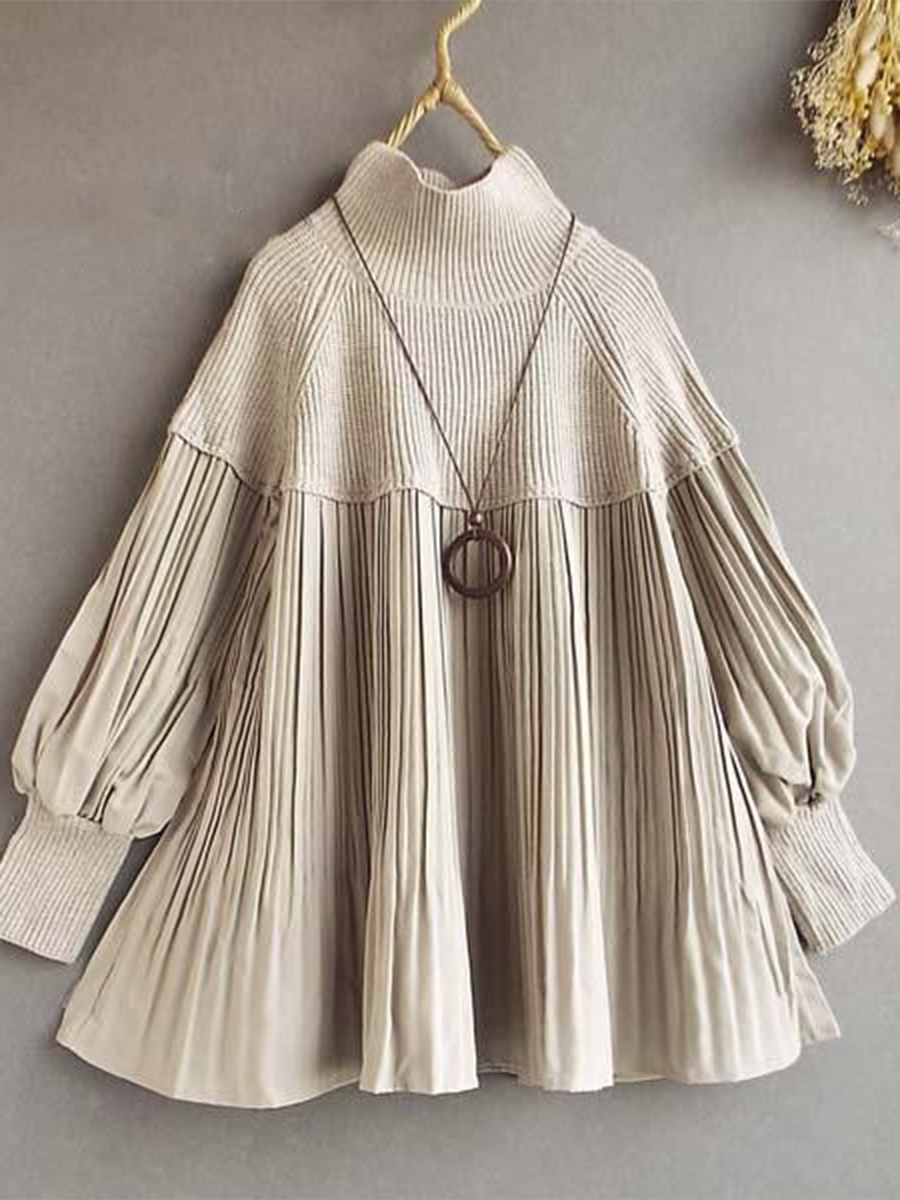 Loose Knitted Patchwork Pleated Lantern Sleeve Top
