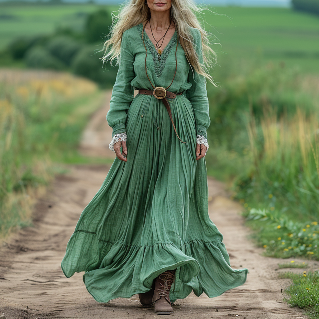 Women's Vintage Pastoral Style V-neck Linen Long-sleeve Maxi Long Dress