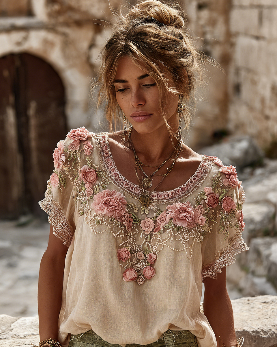 Women's Vintage Floral Embroidered Art Flowy Linen Blend Short Sleeve Casual Tops
