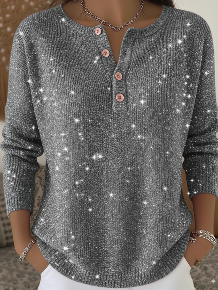 Women's Shiny Henley Neck Solid Color Sweater Top
