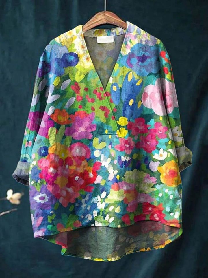 Women's Vintage Lovely Floral Art Print Casual Cotton And Linen V-neck Shirt