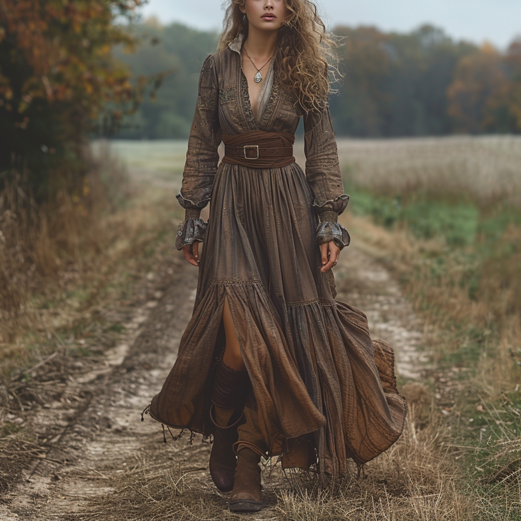 Women's Vintage V-neck Bohemian Pastoral Style Long-sleeved Maxi Long Dress