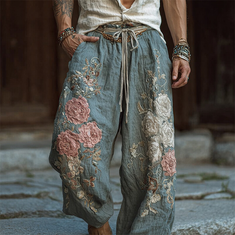 Men's Boho Roses Floral Embroidered Wide Leg Linen Pants