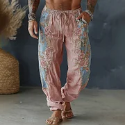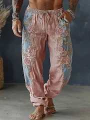 Men's Spring Floral Embroidered Art Print Flowy Linen Blend Casual Pants