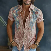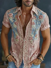 Men's Vintage Spring Floral Embroidered Art Print Flowy Linen Blend Short Sleeve Shirt