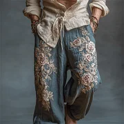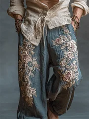Men's Vintage Roses Embroidered Drawstring Wide Leg Linen Pants