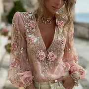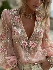 Women's Vintage Pink Floral Embroidered Art V-neck Long Sleeve Linen Blend Blouse