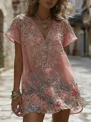 Women's Rose Floral Embroidered Casual V-neck Dress