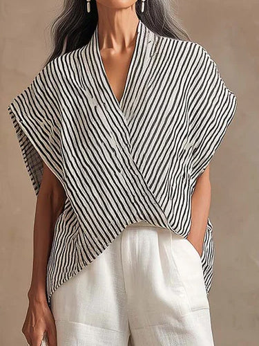 Artistic Cut Striped Top And Wide-leg Pants Linen Two-piece Set