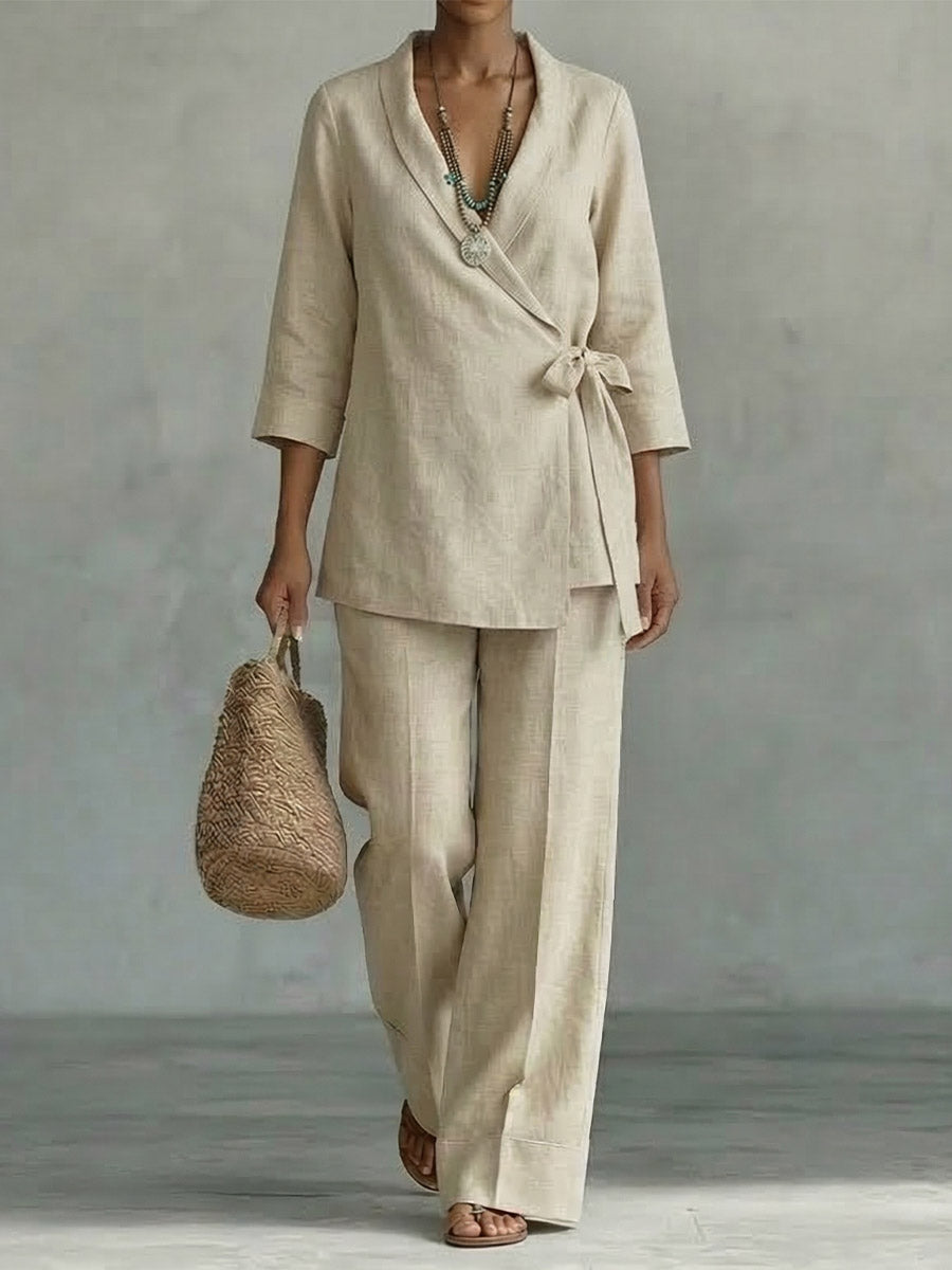 Cotton Linen V-neck Tie-front Top And Casual Trousers Set