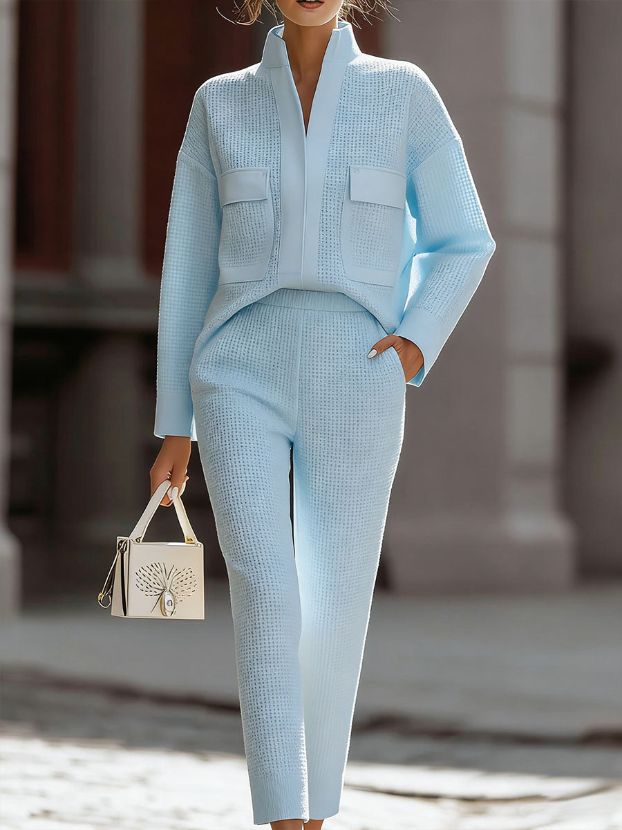 Women's V-neck Long-sleeve Casual Loose Waffle-knit Cotton Top & High-waisted Straight-leg Pants Set