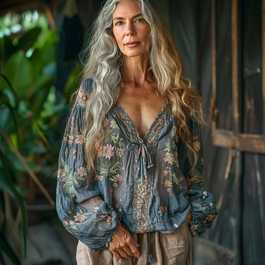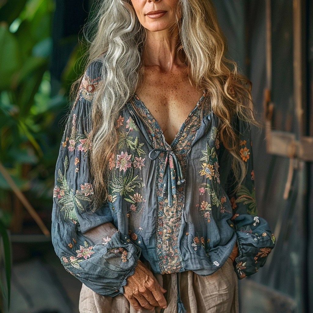 Women's Linen Bohemian Ethnic Floral Loose Shirt