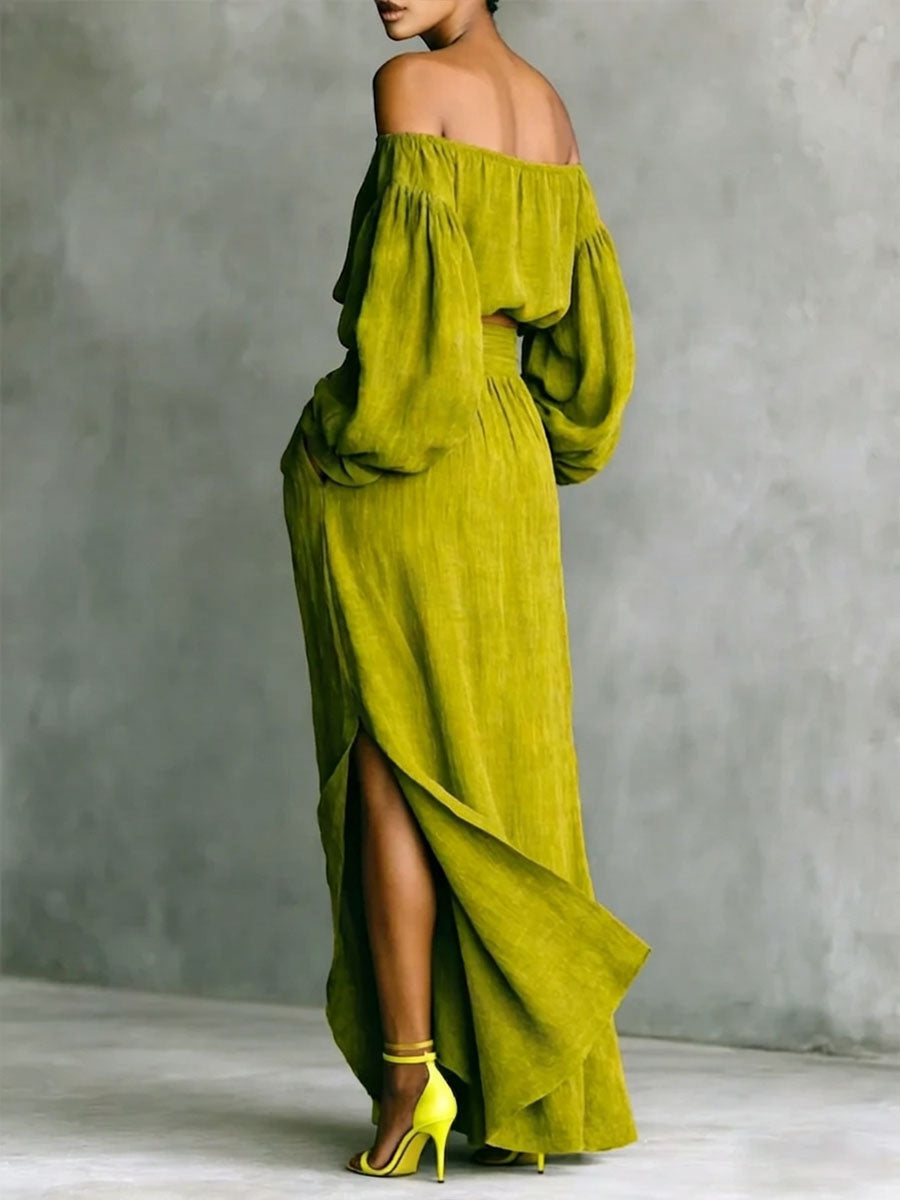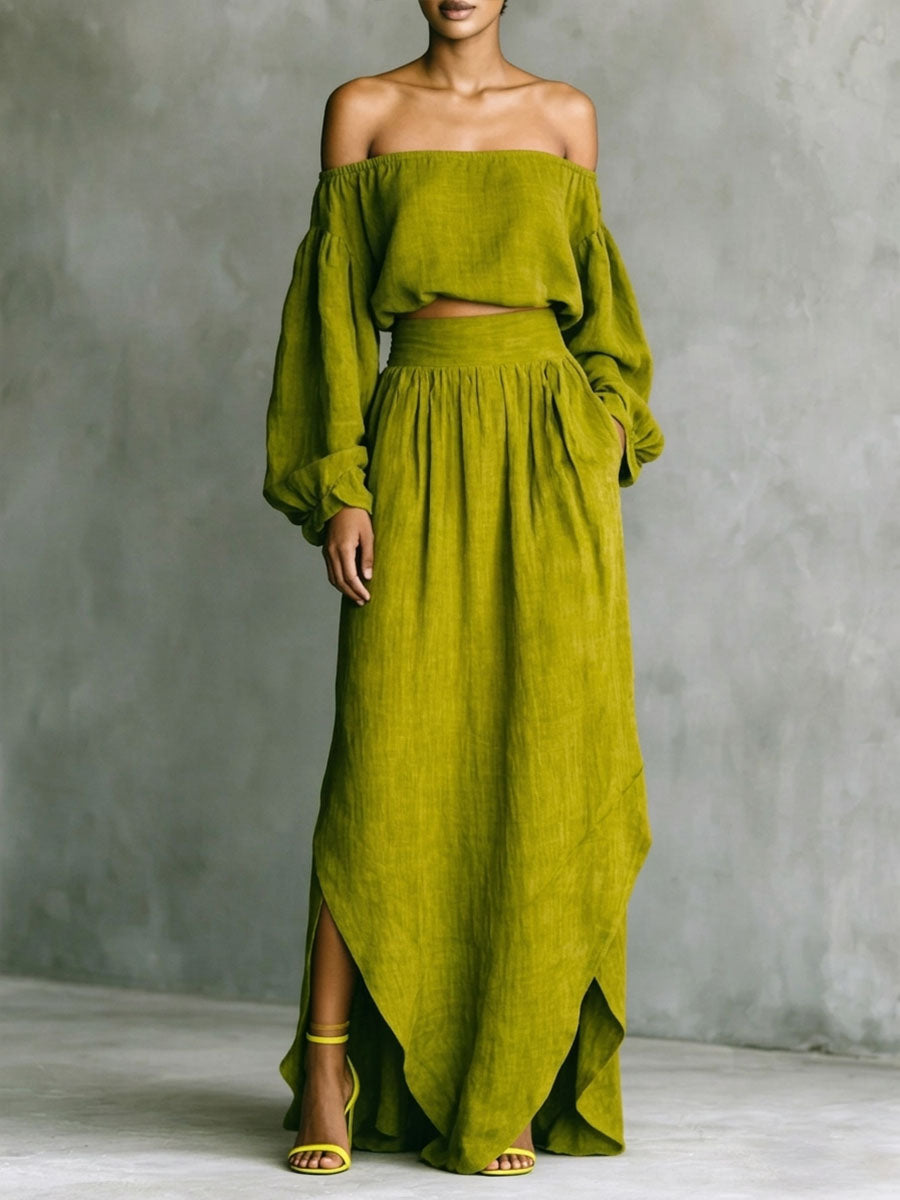 Women's Casual Cotton-linen Two-piece Set: Off-shoulder Top And Asymmetrical Skirt