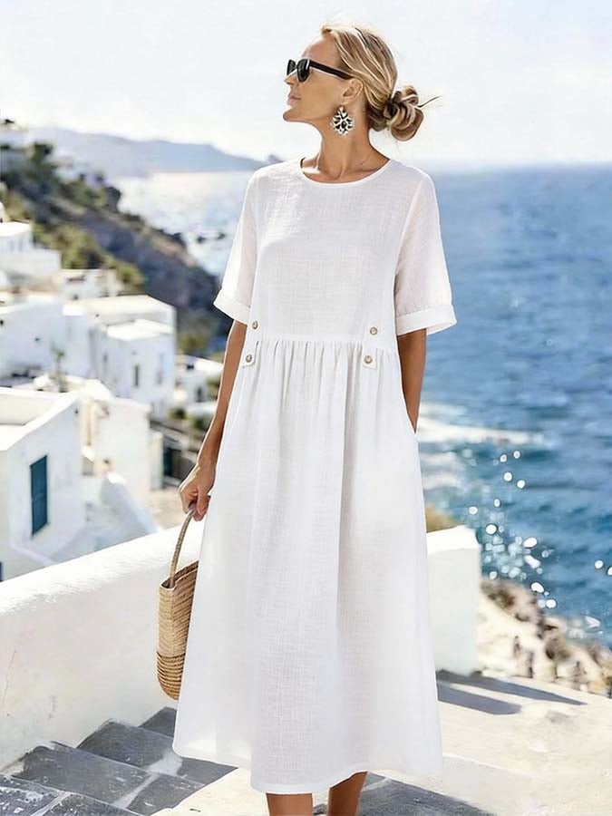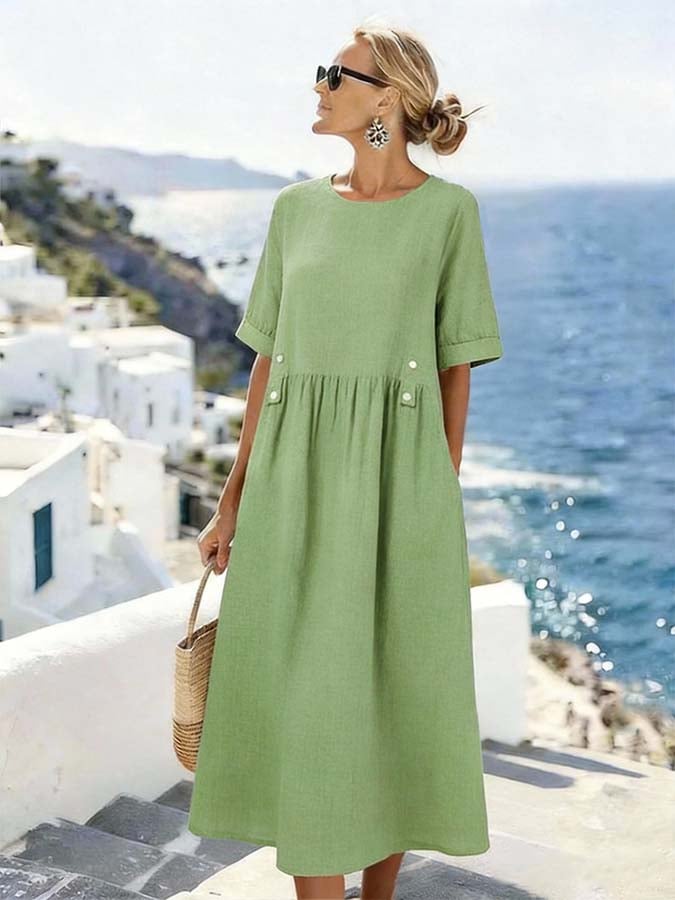 Women's Solid Color Collared Short-sleeved Casual Loose Linen Dress