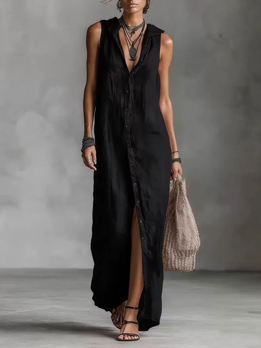 Women's Retro Hooded Solid Color Long-sleeved Cotton Linen Dress