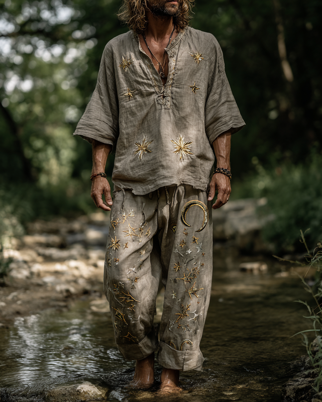 Men's summer vacation leisure star and moon 3D embroidered linen top and casual pants two-piece set 0cf4