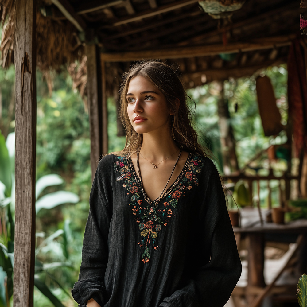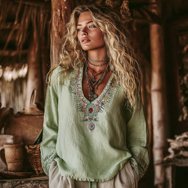 Vintage Bohemian Floral Embroidered Linen V-neck Shirt
