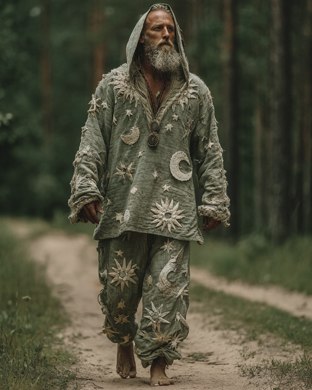Men's Holiday Star and Moon 3D Embroidered Casual Linen Hooded Top & Pants Two-Piece Set