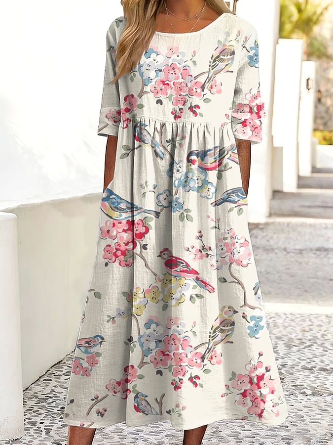 Women's Casual Solid Color Round Neck Mid Sleeve Floral Print Cotton and Linen Dress