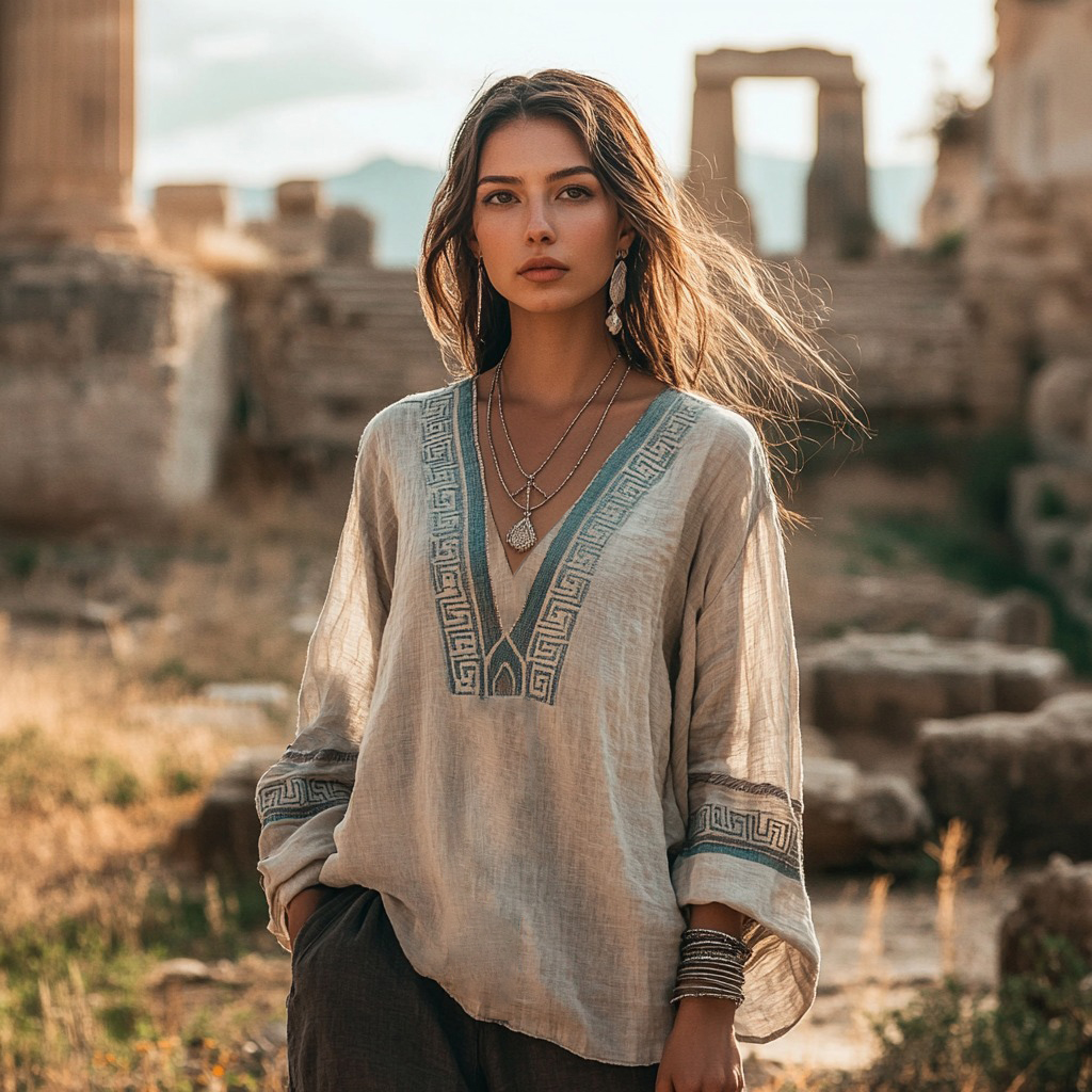 Vintage Greek Key Graphics V-neck Linen Blend T-shirt