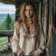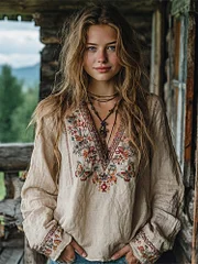 Women's Vintage Floral Embroidered Art V Neck Loose Blouses