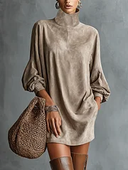 Women's Minimalist Loose-fitting Faux Suede High-neck Mini Dress MDA2423K1Y