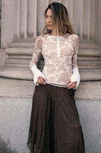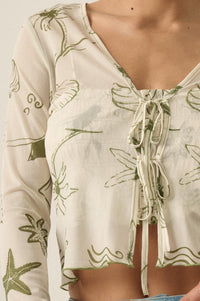 Windswept Petals Floral Mesh Split-Cuff Henley Top
