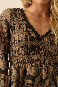 Strong Roots Floral Crepe Velvet-Trim Peasant Top