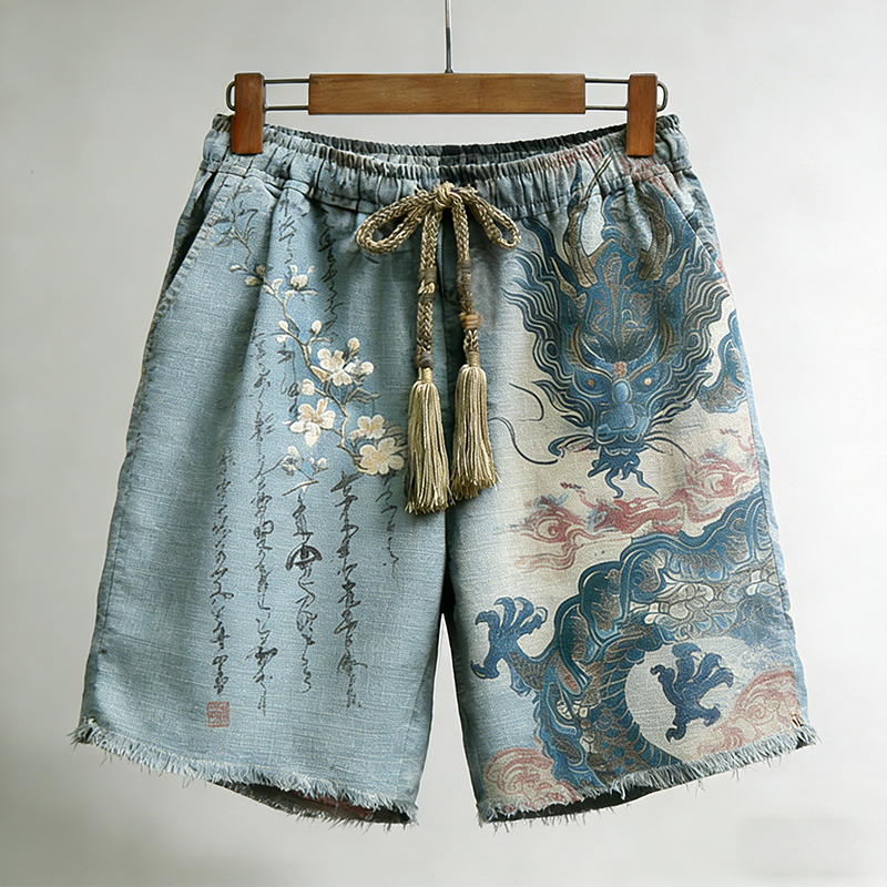 Men's Retro Floral Calligraphy And Dragon Pattern Art Casual Shorts