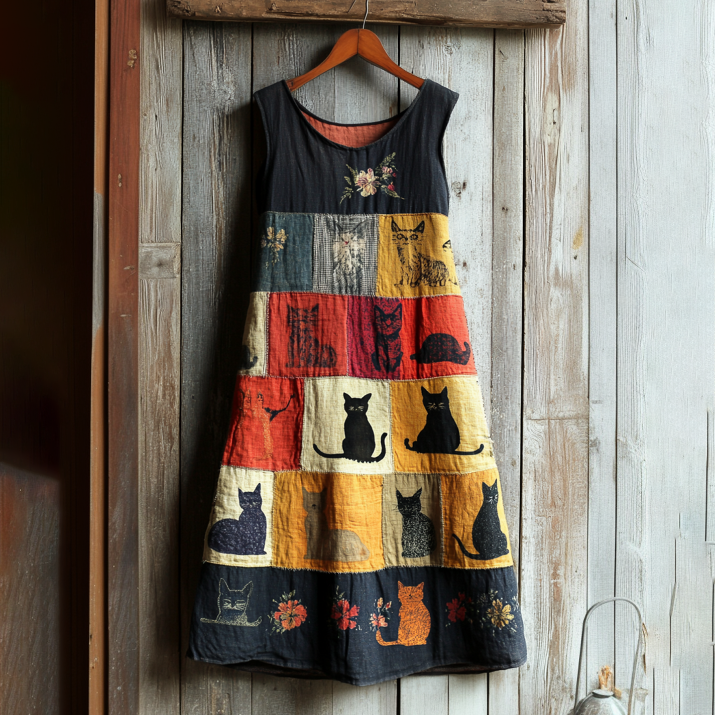 Women's Pop Art Cat Patchwork Design Cotton Line Vest Dress