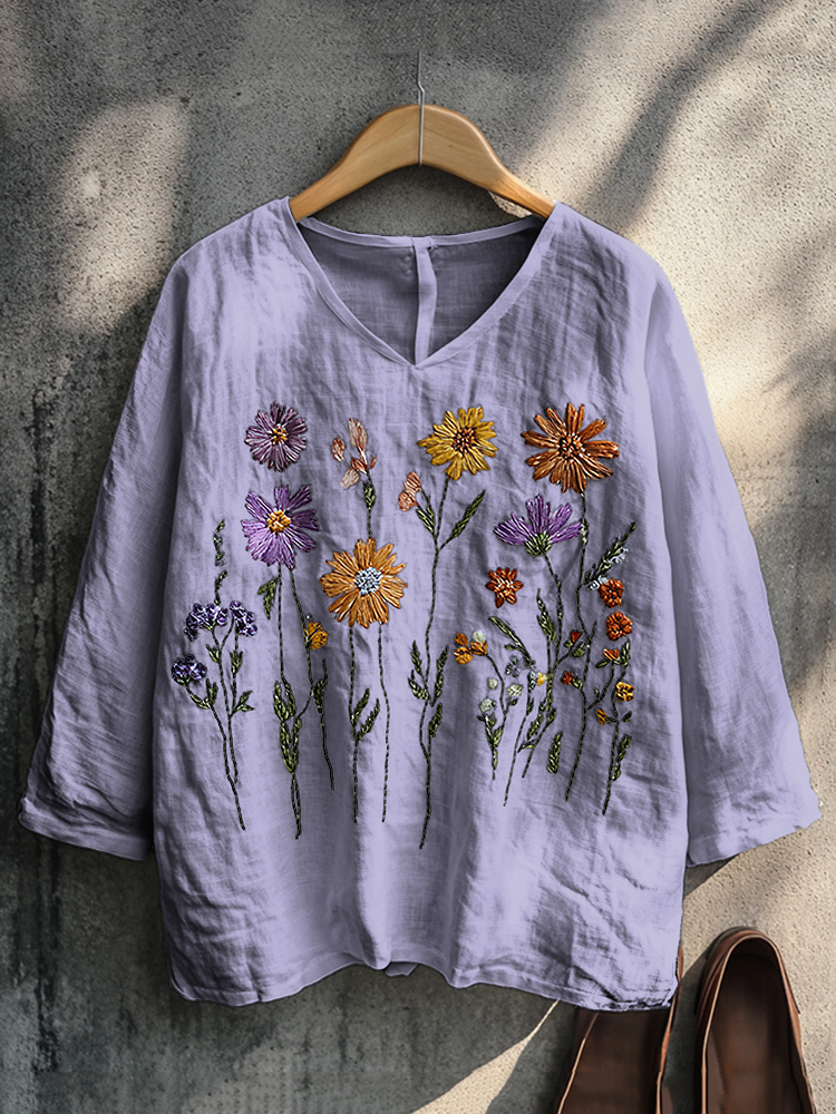 Retro Bohemian Floral Embroidery Art Graphics Linen Blend Loose Blouse