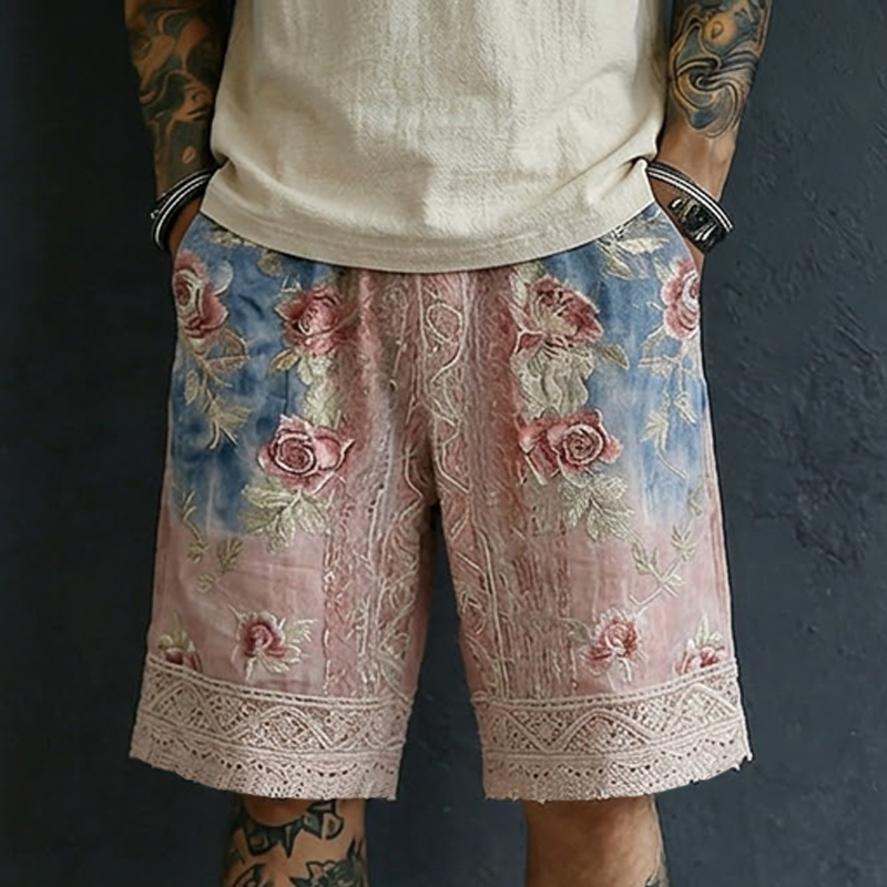 Men's Vintage Spring Floral Embroidered Art Print Flowy Linen Blend Casual Shorts