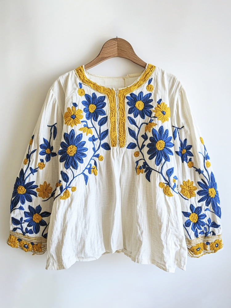 Ukrainian Ethnic Yellow And Blue Floral Embroidery Women's Linen Blouse