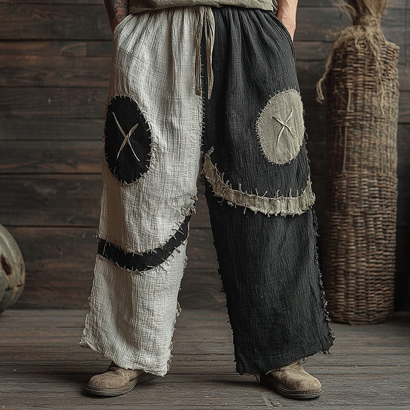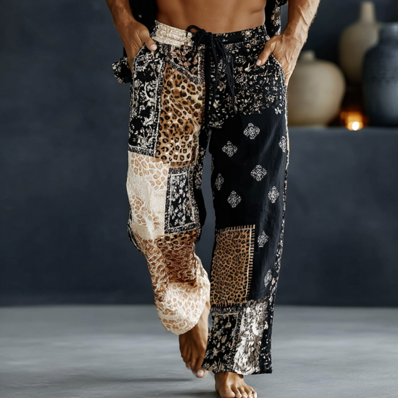 Men's Leopard Patchwork Art Print Flowy Linen Blend Casual Pants