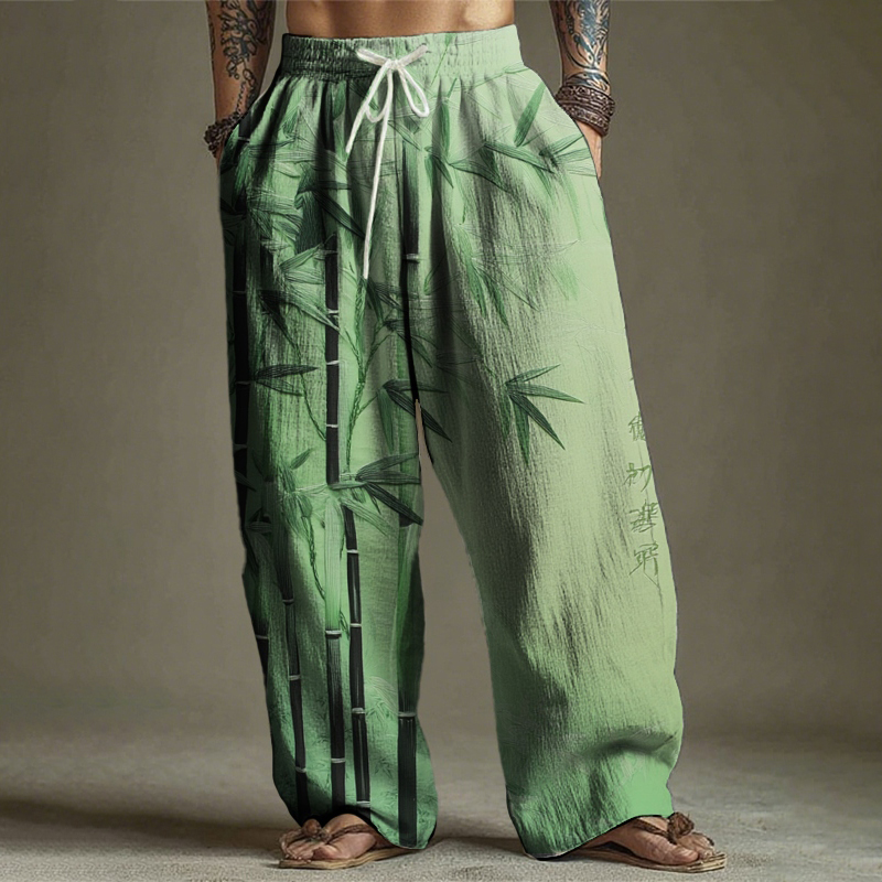 Men's Vintage Chinese Calligraphy Bamboo Print Casual Pants