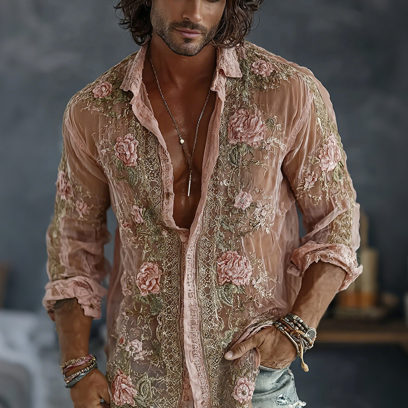 Men's Vintage Spring Floral Embroidered Art Print Flowy Linen Blend Casual Shirt