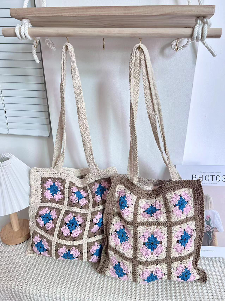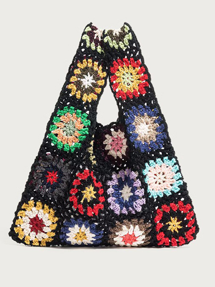 Crochet Hollow Square Flower Large Triangle Contrast Woven Shoulder Bag