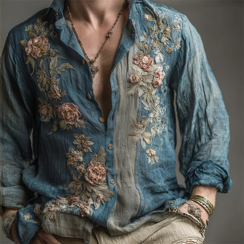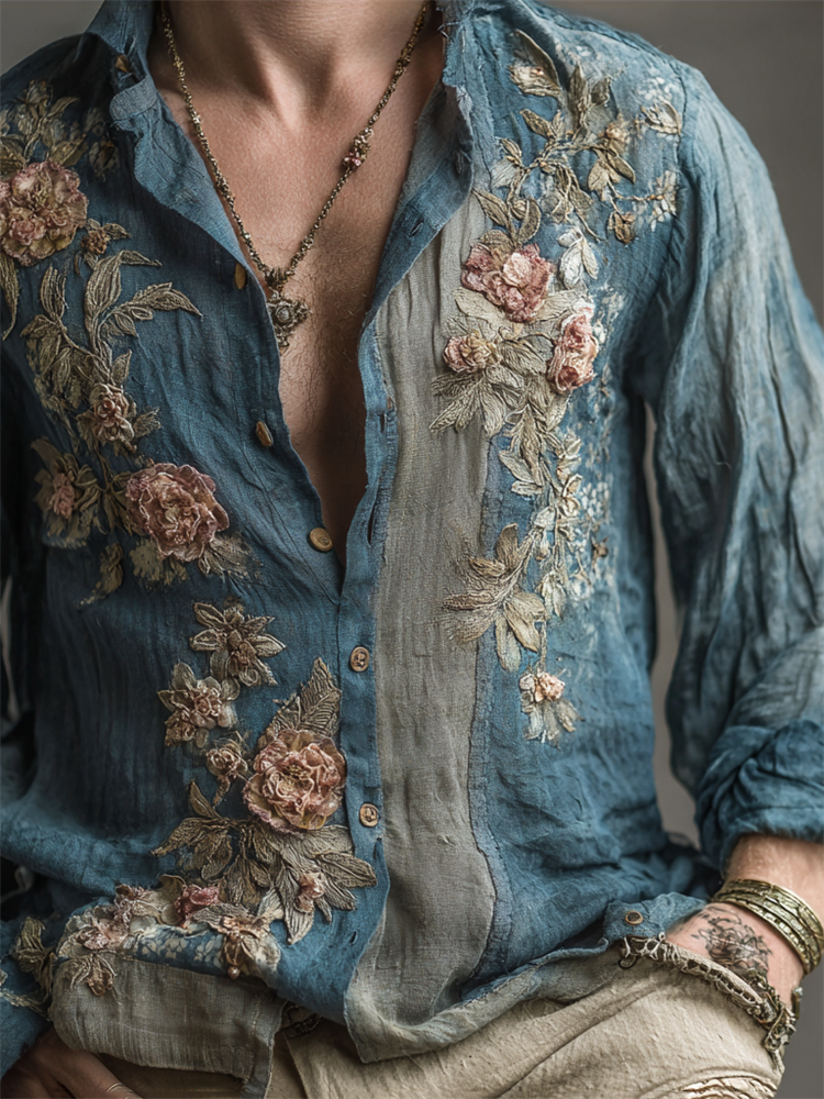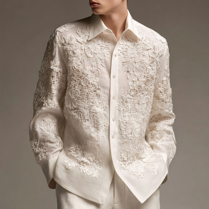 Men's Floral Lace Embroidered Long Sleeve Linen Shirt