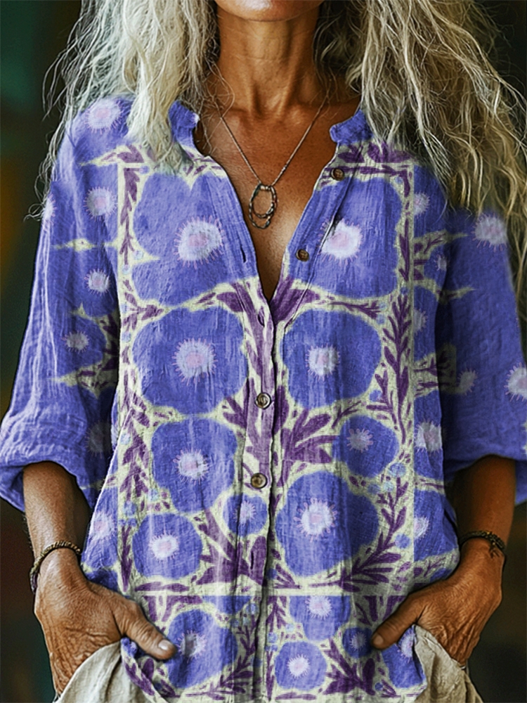 Women's Vintage Ethnic Floral Art Print Casual Cotton And Linen Shirt
