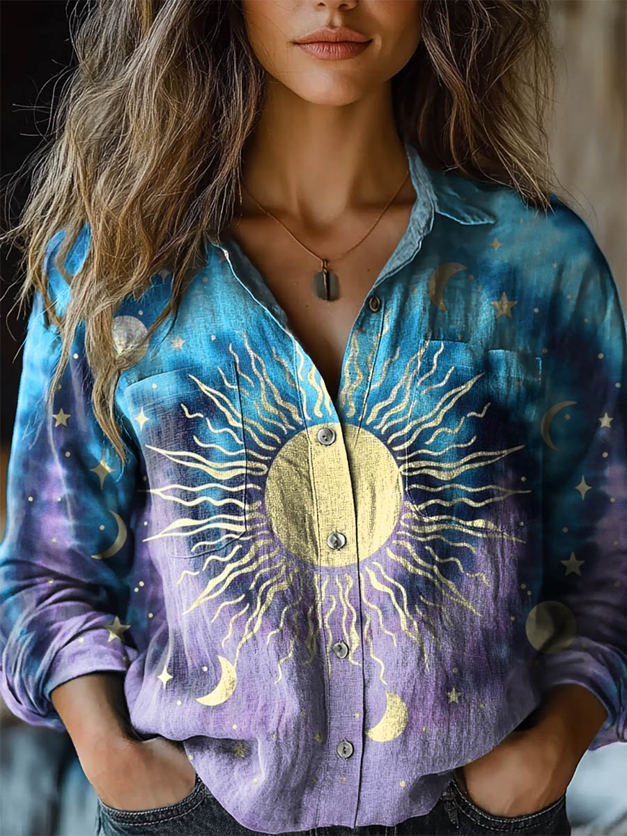 Women's Bohemian Sun Collage Art Pattern Print Casual Cotton Linen Shirt