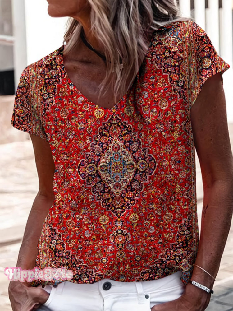 Women's Bohemian Floral Art Print V-neck Casual T-Shirt
